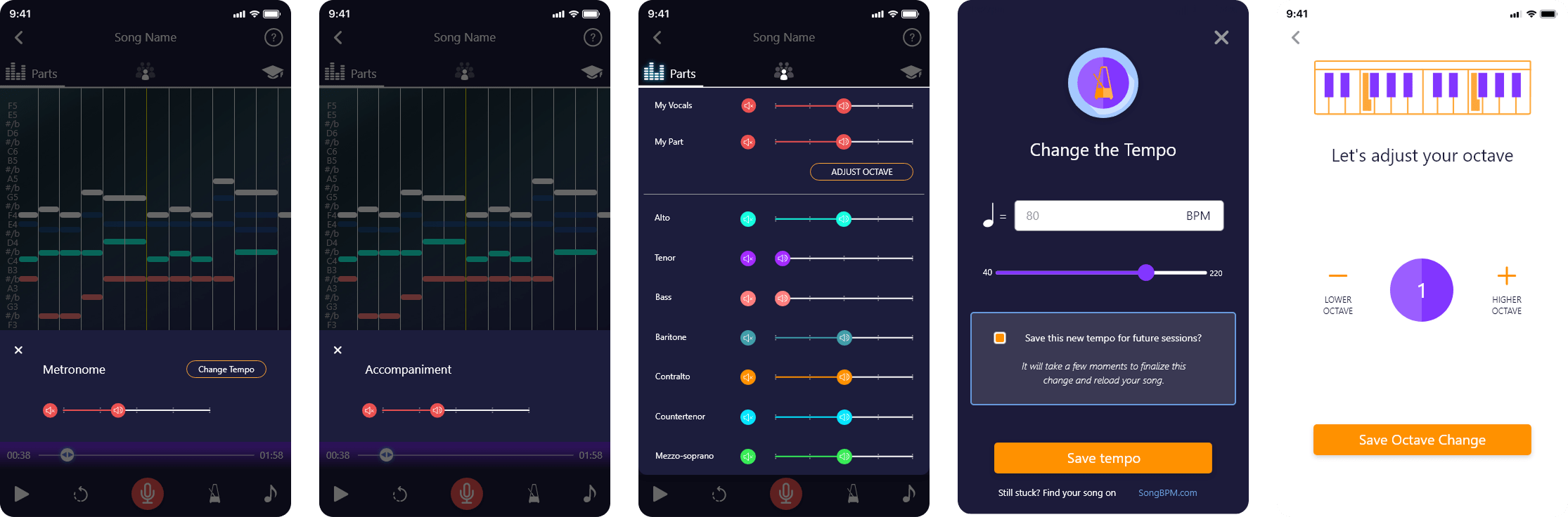 Functionality to record and playback vocals, add a metronome, adjust audio levels for individual vocal parts, modify the octave for custom singing experiences, adjust accompaniment settings to tailor the background music, and change the tempo for a fully personalized and flexible practice session.