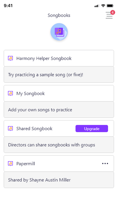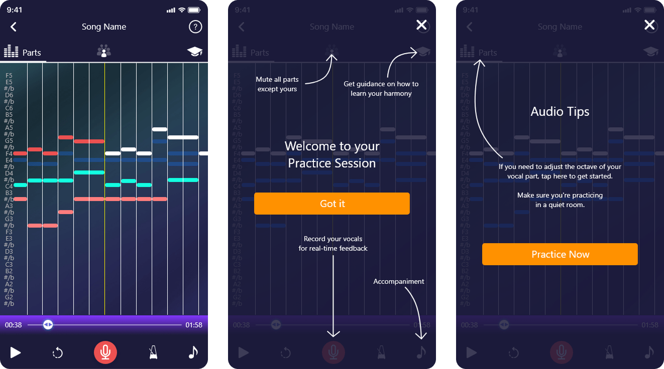 By combining these visual and auditory cues, the practice screen supports both individual learning and collaborative rehearsal. It allows users to track progress over time, refine their vocal technique, and build confidence in a structured, interactive, and motivating environment. Whether practicing solo or preparing for ensemble performances, this screen ensures each rehearsal is efficient, focused, and enjoyable.