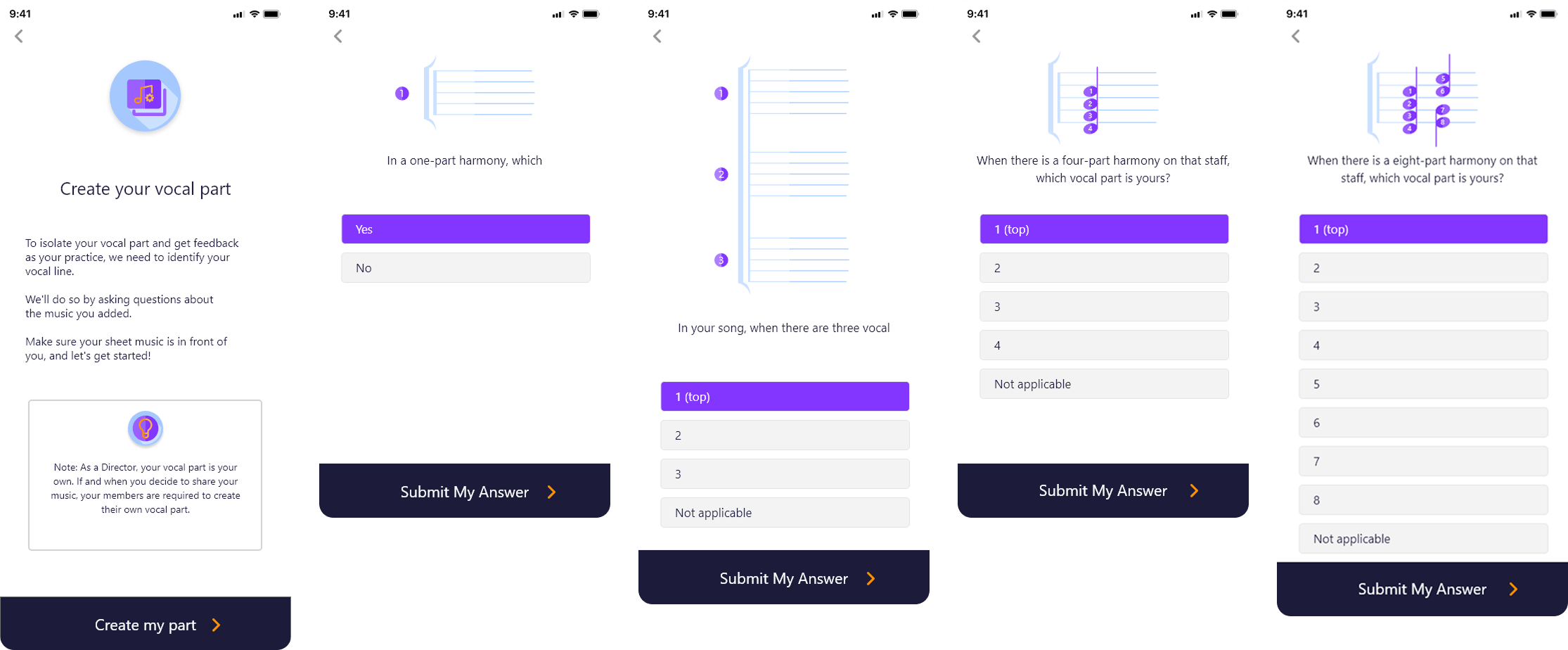 To further enhance personalized rehearsal, a guided questionnaire walkthrough was integrated directly into the upload flow. This interactive wizard is designed to adapt dynamically based on the uploaded sheet music, providing users with a tailored experience from the very start. It helps users identify and isolate their specific vocal part, as well as define the number of vocal lines present in the piece.